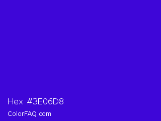Hex #3e06d8 Color is a normal indigo color and the nearest color is Interdimensional Blue #360ccc. Hex code #3e06d8 and RGB value is rgb(62,6,216). In RGB color space, this color is composed of 24% red, 2% green, 85% blue, In CMYK color space, this color is composed of 71% cyan, 97% magenta, 0% yellow , 15% black , In HSL color space, this color has a hue angle of 256° , 95% saturation and 44% lightness.