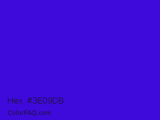 Hex #3e09db Color is a normal indigo color and the nearest color is Interdimensional Blue #360ccc. Hex code #3e09db and RGB value is rgb(62,9,219). In RGB color space, this color is composed of 24% red, 4% green, 86% blue, In CMYK color space, this color is composed of 72% cyan, 96% magenta, 0% yellow , 14% black , In HSL color space, this color has a hue angle of 255° , 92% saturation and 45% lightness.