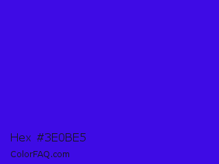 Hex #3e0be5 Color is a normal indigo color and the nearest color is Interdimensional Blue #360ccc. Hex code #3e0be5 and RGB value is rgb(62,11,229). In RGB color space, this color is composed of 24% red, 4% green, 90% blue, In CMYK color space, this color is composed of 73% cyan, 95% magenta, 0% yellow , 10% black , In HSL color space, this color has a hue angle of 254° , 91% saturation and 47% lightness.
