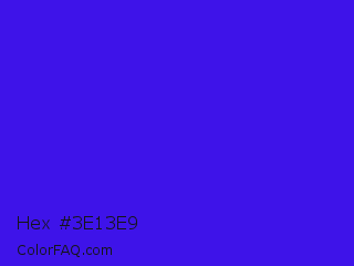 Hex #3e13e9 Color is a normal indigo color and the nearest color is Han Purple #5218fa. Hex code #3e13e9 and RGB value is rgb(62,19,233). In RGB color space, this color is composed of 24% red, 7% green, 91% blue, In CMYK color space, this color is composed of 73% cyan, 92% magenta, 0% yellow , 9% black , In HSL color space, this color has a hue angle of 252° , 85% saturation and 49% lightness.