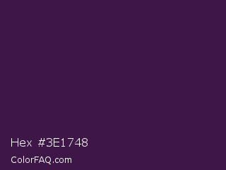 Hex #3e1748 Color is a very dark purple color and the nearest color is Deep Grape #381a51. Hex code #3e1748 and RGB value is rgb(62,23,72). In RGB color space, this color is composed of 24% red, 9% green, 28% blue, In CMYK color space, this color is composed of 14% cyan, 68% magenta, 0% yellow , 72% black , In HSL color space, this color has a hue angle of 288° , 52% saturation and 19% lightness.