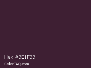 Hex #3e1f33 Color is a very dark magenta color and the nearest color is Dark Purple #301934. Hex code #3e1f33 and RGB value is rgb(62,31,51). In RGB color space, this color is composed of 24% red, 12% green, 20% blue, In CMYK color space, this color is composed of 0% cyan, 50% magenta, 18% yellow , 76% black , In HSL color space, this color has a hue angle of 321° , 33% saturation and 18% lightness.