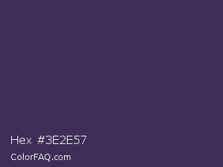 Hex #3e2e57 Color is a dark violet color and the nearest color is Martinique #363050. Hex code #3e2e57 and RGB value is rgb(62,46,87). In RGB color space, this color is composed of 24% red, 18% green, 34% blue, In CMYK color space, this color is composed of 29% cyan, 47% magenta, 0% yellow , 66% black , In HSL color space, this color has a hue angle of 263° , 31% saturation and 26% lightness.
