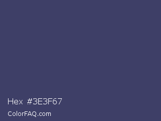 Hex #3e3f67 Color is a normal blue color and the nearest color is Deep Koamaru #333366. Hex code #3e3f67 and RGB value is rgb(62,63,103). In RGB color space, this color is composed of 24% red, 25% green, 40% blue, In CMYK color space, this color is composed of 40% cyan, 39% magenta, 0% yellow , 60% black , In HSL color space, this color has a hue angle of 239° , 25% saturation and 32% lightness.