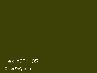 Hex #3e4105 Color is a very dark yellow color and the nearest color is Waiouru #363c0d. Hex code #3e4105 and RGB value is rgb(62,65,5). In RGB color space, this color is composed of 24% red, 25% green, 2% blue, In CMYK color space, this color is composed of 5% cyan, 0% magenta, 92% yellow , 75% black , In HSL color space, this color has a hue angle of 63° , 86% saturation and 14% lightness.