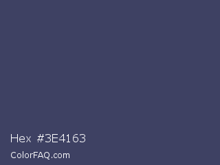 Hex #3e4163 Color is a normal blue color and the nearest color is Gun Powder #414257. Hex code #3e4163 and RGB value is rgb(62,65,99). In RGB color space, this color is composed of 24% red, 25% green, 39% blue, In CMYK color space, this color is composed of 37% cyan, 34% magenta, 0% yellow , 61% black , In HSL color space, this color has a hue angle of 235° , 23% saturation and 32% lightness.