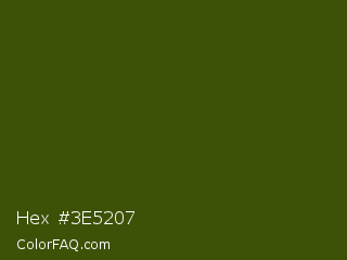Hex #3e5207 Color is a very dark lime color and the nearest color is Verdun Green #495400. Hex code #3e5207 and RGB value is rgb(62,82,7). In RGB color space, this color is composed of 24% red, 32% green, 3% blue, In CMYK color space, this color is composed of 24% cyan, 0% magenta, 91% yellow , 68% black , In HSL color space, this color has a hue angle of 76° , 84% saturation and 17% lightness.