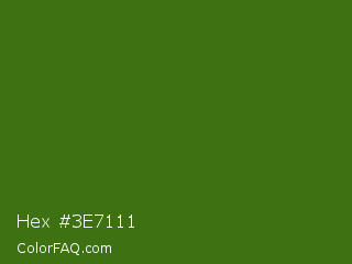 Hex #3e7111 Color is a dark green color and the nearest color is Green Leaf #436a0d. Hex code #3e7111 and RGB value is rgb(62,113,17). In RGB color space, this color is composed of 24% red, 44% green, 7% blue, In CMYK color space, this color is composed of 45% cyan, 0% magenta, 85% yellow , 56% black , In HSL color space, this color has a hue angle of 92° , 74% saturation and 25% lightness.