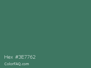 Hex #3e7762 Color is a normal green color and the nearest color is Amazon #3b7a57. Hex code #3e7762 and RGB value is rgb(62,119,98). In RGB color space, this color is composed of 24% red, 47% green, 38% blue, In CMYK color space, this color is composed of 48% cyan, 0% magenta, 18% yellow , 53% black , In HSL color space, this color has a hue angle of 158° , 31% saturation and 35% lightness.