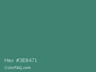 Hex #3e8471 Color is a normal cyan color and the nearest color is Viridian #40826d. Hex code #3e8471 and RGB value is rgb(62,132,113). In RGB color space, this color is composed of 24% red, 52% green, 44% blue, In CMYK color space, this color is composed of 53% cyan, 0% magenta, 14% yellow , 48% black , In HSL color space, this color has a hue angle of 164° , 36% saturation and 38% lightness.