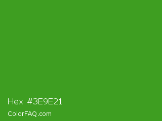 Hex #3e9e21 Color is a normal green color and the nearest color is Slimy Green #299617. Hex code #3e9e21 and RGB value is rgb(62,158,33). In RGB color space, this color is composed of 24% red, 62% green, 13% blue, In CMYK color space, this color is composed of 61% cyan, 0% magenta, 79% yellow , 38% black , In HSL color space, this color has a hue angle of 106° , 65% saturation and 37% lightness.