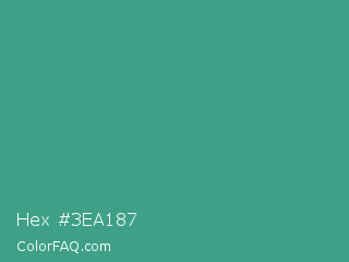 Hex #3ea187 Color is a normal cyan color and the nearest color is Zomp #39a78e. Hex code #3ea187 and RGB value is rgb(62,161,135). In RGB color space, this color is composed of 24% red, 63% green, 53% blue, In CMYK color space, this color is composed of 61% cyan, 0% magenta, 16% yellow , 37% black , In HSL color space, this color has a hue angle of 164° , 44% saturation and 44% lightness.