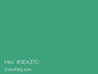 Hex #3ea37d Color is a normal green color and the nearest color is Ocean Green #41aa78. Hex code #3ea37d and RGB value is rgb(62,163,125). In RGB color space, this color is composed of 24% red, 64% green, 49% blue, In CMYK color space, this color is composed of 62% cyan, 0% magenta, 23% yellow , 36% black , In HSL color space, this color has a hue angle of 157° , 45% saturation and 44% lightness.
