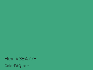 Hex #3ea77f Color is a normal green color and the nearest color is Ocean Green #41aa78. Hex code #3ea77f and RGB value is rgb(62,167,127). In RGB color space, this color is composed of 24% red, 65% green, 50% blue, In CMYK color space, this color is composed of 63% cyan, 0% magenta, 24% yellow , 35% black , In HSL color space, this color has a hue angle of 157° , 46% saturation and 45% lightness.