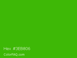 Hex #3eb806 Color is a normal green color and the nearest color is Kelly Green #4cbb17. Hex code #3eb806 and RGB value is rgb(62,184,6). In RGB color space, this color is composed of 24% red, 72% green, 2% blue, In CMYK color space, this color is composed of 66% cyan, 0% magenta, 97% yellow , 28% black , In HSL color space, this color has a hue angle of 101° , 94% saturation and 37% lightness.
