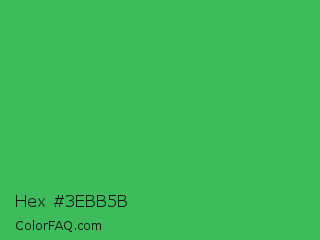 Hex #3ebb5b Color is a normal green color and the nearest color is Chateau Green #40a860. Hex code #3ebb5b and RGB value is rgb(62,187,91). In RGB color space, this color is composed of 24% red, 73% green, 36% blue, In CMYK color space, this color is composed of 67% cyan, 0% magenta, 51% yellow , 27% black , In HSL color space, this color has a hue angle of 134° , 50% saturation and 49% lightness.