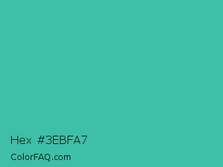 Hex #3ebfa7 Color is a normal cyan color and the nearest color is Puerto Rico #3fc1aa. Hex code #3ebfa7 and RGB value is rgb(62,191,167). In RGB color space, this color is composed of 24% red, 75% green, 65% blue, In CMYK color space, this color is composed of 68% cyan, 0% magenta, 13% yellow , 25% black , In HSL color space, this color has a hue angle of 169° , 51% saturation and 50% lightness.