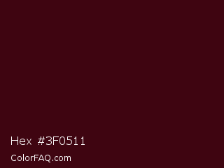 Hex #3f0511 Color is a very dark red color and the nearest color is Aubergine #3b0910. Hex code #3f0511 and RGB value is rgb(63,5,17). In RGB color space, this color is composed of 25% red, 2% green, 7% blue, In CMYK color space, this color is composed of 0% cyan, 92% magenta, 73% yellow , 75% black , In HSL color space, this color has a hue angle of 348° , 85% saturation and 13% lightness.