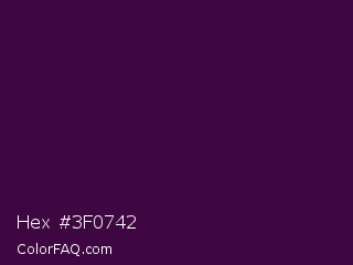Hex #3f0742 Color is a very dark magenta color and the nearest color is Loulou #460b41. Hex code #3f0742 and RGB value is rgb(63,7,66). In RGB color space, this color is composed of 25% red, 3% green, 26% blue, In CMYK color space, this color is composed of 5% cyan, 89% magenta, 0% yellow , 74% black , In HSL color space, this color has a hue angle of 297° , 81% saturation and 14% lightness.