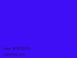 Hex #3f0df6 Color is a normal indigo color and the nearest color is Electric Ultramarine #3f00ff. Hex code #3f0df6 and RGB value is rgb(63,13,246). In RGB color space, this color is composed of 25% red, 5% green, 96% blue, In CMYK color space, this color is composed of 74% cyan, 95% magenta, 0% yellow , 4% black , In HSL color space, this color has a hue angle of 253° , 93% saturation and 51% lightness.