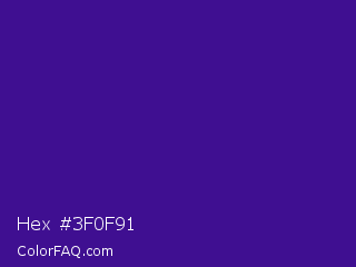 Hex #3f0f91 Color is a normal violet color and the nearest color is Pixie Powder #391285. Hex code #3f0f91 and RGB value is rgb(63,15,145). In RGB color space, this color is composed of 25% red, 6% green, 57% blue, In CMYK color space, this color is composed of 57% cyan, 90% magenta, 0% yellow , 43% black , In HSL color space, this color has a hue angle of 262° , 81% saturation and 31% lightness.