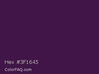 Hex #3f1645 Color is a very dark magenta color and the nearest color is Valentino #350e42. Hex code #3f1645 and RGB value is rgb(63,22,69). In RGB color space, this color is composed of 25% red, 9% green, 27% blue, In CMYK color space, this color is composed of 9% cyan, 68% magenta, 0% yellow , 73% black , In HSL color space, this color has a hue angle of 292° , 52% saturation and 18% lightness.