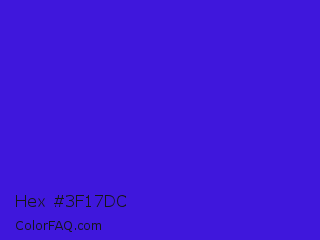 Hex #3f17dc Color is a normal indigo color and the nearest color is Interdimensional Blue #360ccc. Hex code #3f17dc and RGB value is rgb(63,23,220). In RGB color space, this color is composed of 25% red, 9% green, 86% blue, In CMYK color space, this color is composed of 71% cyan, 90% magenta, 0% yellow , 14% black , In HSL color space, this color has a hue angle of 252° , 81% saturation and 48% lightness.