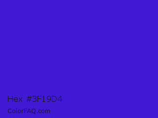 Hex #3f19d4 Color is a normal indigo color and the nearest color is Interdimensional Blue #360ccc. Hex code #3f19d4 and RGB value is rgb(63,25,212). In RGB color space, this color is composed of 25% red, 10% green, 83% blue, In CMYK color space, this color is composed of 70% cyan, 88% magenta, 0% yellow , 17% black , In HSL color space, this color has a hue angle of 252° , 79% saturation and 46% lightness.