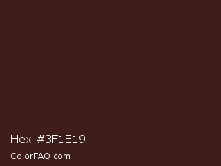 Hex #3f1e19 Color is a very dark red color and the nearest color is Cedar #3e1c14. Hex code #3f1e19 and RGB value is rgb(63,30,25). In RGB color space, this color is composed of 25% red, 12% green, 10% blue, In CMYK color space, this color is composed of 0% cyan, 52% magenta, 60% yellow , 75% black , In HSL color space, this color has a hue angle of 8° , 43% saturation and 17% lightness.