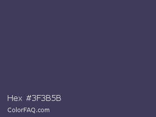 Hex #3f3b5b Color is a dark indigo color and the nearest color is Gun Powder #414257. Hex code #3f3b5b and RGB value is rgb(63,59,91). In RGB color space, this color is composed of 25% red, 23% green, 36% blue, In CMYK color space, this color is composed of 31% cyan, 35% magenta, 0% yellow , 64% black , In HSL color space, this color has a hue angle of 248° , 21% saturation and 29% lightness.