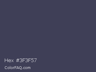 Hex #3f3f57 Color is a dark blue color and the nearest color is Gun Powder #414257. Hex code #3f3f57 and RGB value is rgb(63,63,87). In RGB color space, this color is composed of 25% red, 25% green, 34% blue, In CMYK color space, this color is composed of 28% cyan, 28% magenta, 0% yellow , 66% black , In HSL color space, this color has a hue angle of 240° , 16% saturation and 29% lightness.