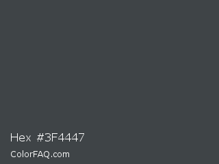 Hex #3f4447 Color is a dark blue color and the nearest color is Cape Cod #3c4443. Hex code #3f4447 and RGB value is rgb(63,68,71). In RGB color space, this color is composed of 25% red, 27% green, 28% blue, In CMYK color space, this color is composed of 11% cyan, 4% magenta, 0% yellow , 72% black , In HSL color space, this color has a hue angle of 203° , 6% saturation and 26% lightness.
