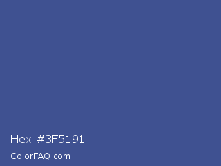 Hex #3f5191 Color is a normal blue color and the nearest color is Chambray #354e8c. Hex code #3f5191 and RGB value is rgb(63,81,145). In RGB color space, this color is composed of 25% red, 32% green, 57% blue, In CMYK color space, this color is composed of 57% cyan, 44% magenta, 0% yellow , 43% black , In HSL color space, this color has a hue angle of 227° , 39% saturation and 41% lightness.