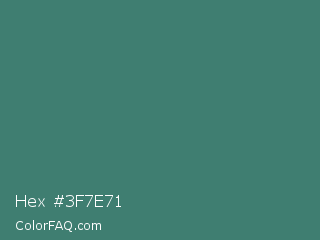 Hex #3f7e71 Color is a normal cyan color and the nearest color is Viridian #40826d. Hex code #3f7e71 and RGB value is rgb(63,126,113). In RGB color space, this color is composed of 25% red, 49% green, 44% blue, In CMYK color space, this color is composed of 50% cyan, 0% magenta, 10% yellow , 51% black , In HSL color space, this color has a hue angle of 168° , 33% saturation and 37% lightness.