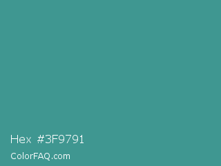 Hex #3f9791 Color is a normal cyan color and the nearest color is Zomp #39a78e. Hex code #3f9791 and RGB value is rgb(63,151,145). In RGB color space, this color is composed of 25% red, 59% green, 57% blue, In CMYK color space, this color is composed of 58% cyan, 0% magenta, 4% yellow , 41% black , In HSL color space, this color has a hue angle of 176° , 41% saturation and 42% lightness.