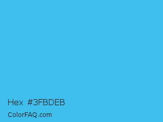 Hex #3fbdeb Color is a normal blue color and the nearest color is Picton Blue #45b1e8. Hex code #3fbdeb and RGB value is rgb(63,189,235). In RGB color space, this color is composed of 25% red, 74% green, 92% blue, In CMYK color space, this color is composed of 73% cyan, 20% magenta, 0% yellow , 8% black , In HSL color space, this color has a hue angle of 196° , 81% saturation and 58% lightness.
