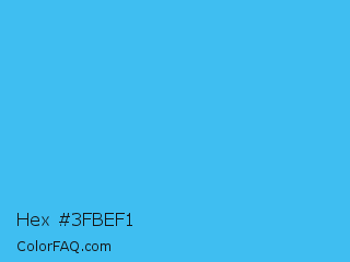Hex #3fbef1 Color is a normal blue color and the nearest color is Picton Blue #45b1e8. Hex code #3fbef1 and RGB value is rgb(63,190,241). In RGB color space, this color is composed of 25% red, 75% green, 95% blue, In CMYK color space, this color is composed of 74% cyan, 21% magenta, 0% yellow , 5% black , In HSL color space, this color has a hue angle of 197° , 86% saturation and 60% lightness.