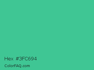 Hex #3fc694 Color is a normal green color and the nearest color is Ocean Green #48bf91. Hex code #3fc694 and RGB value is rgb(63,198,148). In RGB color space, this color is composed of 25% red, 78% green, 58% blue, In CMYK color space, this color is composed of 68% cyan, 0% magenta, 25% yellow , 22% black , In HSL color space, this color has a hue angle of 158° , 54% saturation and 51% lightness.