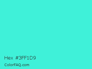 Hex #3ff1d9 Color is a normal cyan color and the nearest color is Turquoise #40e0d0. Hex code #3ff1d9 and RGB value is rgb(63,241,217). In RGB color space, this color is composed of 25% red, 95% green, 85% blue, In CMYK color space, this color is composed of 74% cyan, 0% magenta, 10% yellow , 5% black , In HSL color space, this color has a hue angle of 172° , 86% saturation and 60% lightness.