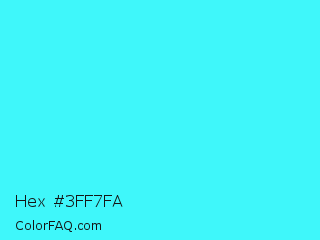 Hex #3ff7fa Color is a light cyan color and the nearest color is Loeen #15f2fd. Hex code #3ff7fa and RGB value is rgb(63,247,250). In RGB color space, this color is composed of 25% red, 97% green, 98% blue, In CMYK color space, this color is composed of 75% cyan, 1% magenta, 0% yellow , 2% black , In HSL color space, this color has a hue angle of 181° , 95% saturation and 61% lightness.