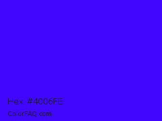 Hex #4006fe Color is a normal indigo color and the nearest color is Electric Ultramarine #3f00ff. Hex code #4006fe and RGB value is rgb(64,6,254). In RGB color space, this color is composed of 25% red, 2% green, 100% blue, In CMYK color space, this color is composed of 75% cyan, 98% magenta, 0% yellow , 0% black , In HSL color space, this color has a hue angle of 254° , 99% saturation and 51% lightness.