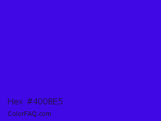 Hex #4008e5 Color is a normal indigo color and the nearest color is Interdimensional Blue #360ccc. Hex code #4008e5 and RGB value is rgb(64,8,229). In RGB color space, this color is composed of 25% red, 3% green, 90% blue, In CMYK color space, this color is composed of 72% cyan, 97% magenta, 0% yellow , 10% black , In HSL color space, this color has a hue angle of 255° , 93% saturation and 46% lightness.