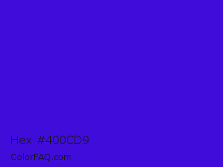Hex #400cd9 Color is a normal indigo color and the nearest color is Interdimensional Blue #360ccc. Hex code #400cd9 and RGB value is rgb(64,12,217). In RGB color space, this color is composed of 25% red, 5% green, 85% blue, In CMYK color space, this color is composed of 71% cyan, 94% magenta, 0% yellow , 15% black , In HSL color space, this color has a hue angle of 255° , 90% saturation and 45% lightness.