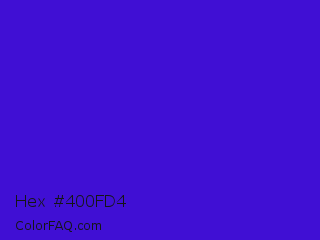 Hex #400fd4 Color is a normal indigo color and the nearest color is Interdimensional Blue #360ccc. Hex code #400fd4 and RGB value is rgb(64,15,212). In RGB color space, this color is composed of 25% red, 6% green, 83% blue, In CMYK color space, this color is composed of 70% cyan, 93% magenta, 0% yellow , 17% black , In HSL color space, this color has a hue angle of 255° , 87% saturation and 45% lightness.