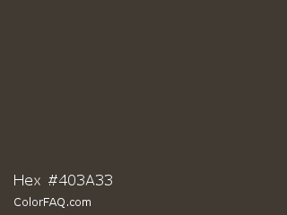 Hex #403a33 Color is a dark orange color and the nearest color is Merlin #413c37. Hex code #403a33 and RGB value is rgb(64,58,51). In RGB color space, this color is composed of 25% red, 23% green, 20% blue, In CMYK color space, this color is composed of 0% cyan, 9% magenta, 20% yellow , 75% black , In HSL color space, this color has a hue angle of 32° , 11% saturation and 23% lightness.