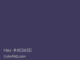 Hex #403a5d Color is a dark indigo color and the nearest color is Gun Powder #414257. Hex code #403a5d and RGB value is rgb(64,58,93). In RGB color space, this color is composed of 25% red, 23% green, 36% blue, In CMYK color space, this color is composed of 31% cyan, 38% magenta, 0% yellow , 64% black , In HSL color space, this color has a hue angle of 250° , 23% saturation and 30% lightness.