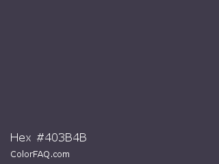 Hex #403b4b Color is a dark indigo color and the nearest color is Ship Gray #3e3a44. Hex code #403b4b and RGB value is rgb(64,59,75). In RGB color space, this color is composed of 25% red, 23% green, 29% blue, In CMYK color space, this color is composed of 15% cyan, 21% magenta, 0% yellow , 71% black , In HSL color space, this color has a hue angle of 259° , 12% saturation and 26% lightness.
