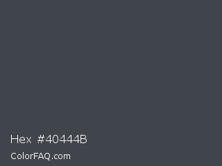 Hex #40444b Color is a dark blue color and the nearest color is Arsenic #3b444b. Hex code #40444b and RGB value is rgb(64,68,75). In RGB color space, this color is composed of 25% red, 27% green, 29% blue, In CMYK color space, this color is composed of 15% cyan, 9% magenta, 0% yellow , 71% black , In HSL color space, this color has a hue angle of 218° , 8% saturation and 27% lightness.