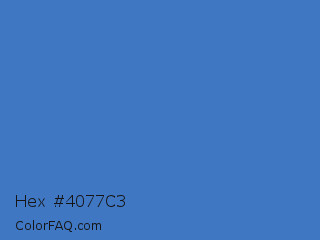 Hex #4077c3 Color is a normal blue color and the nearest color is Cyan Blue Azure #4682bf. Hex code #4077c3 and RGB value is rgb(64,119,195). In RGB color space, this color is composed of 25% red, 47% green, 76% blue, In CMYK color space, this color is composed of 67% cyan, 39% magenta, 0% yellow , 24% black , In HSL color space, this color has a hue angle of 215° , 52% saturation and 51% lightness.