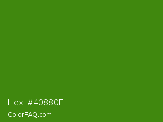 Hex #40880e Color is a dark green color and the nearest color is La Palma #368716. Hex code #40880e and RGB value is rgb(64,136,14). In RGB color space, this color is composed of 25% red, 53% green, 5% blue, In CMYK color space, this color is composed of 53% cyan, 0% magenta, 90% yellow , 47% black , In HSL color space, this color has a hue angle of 95° , 81% saturation and 29% lightness.